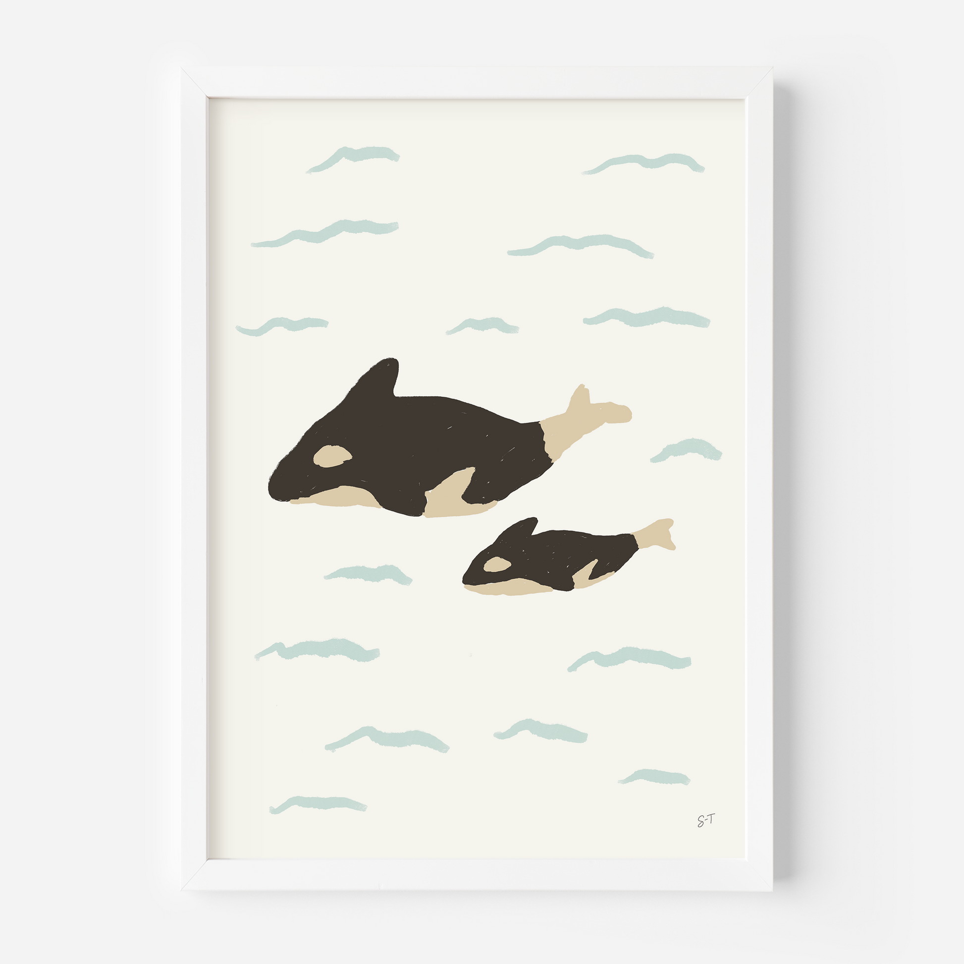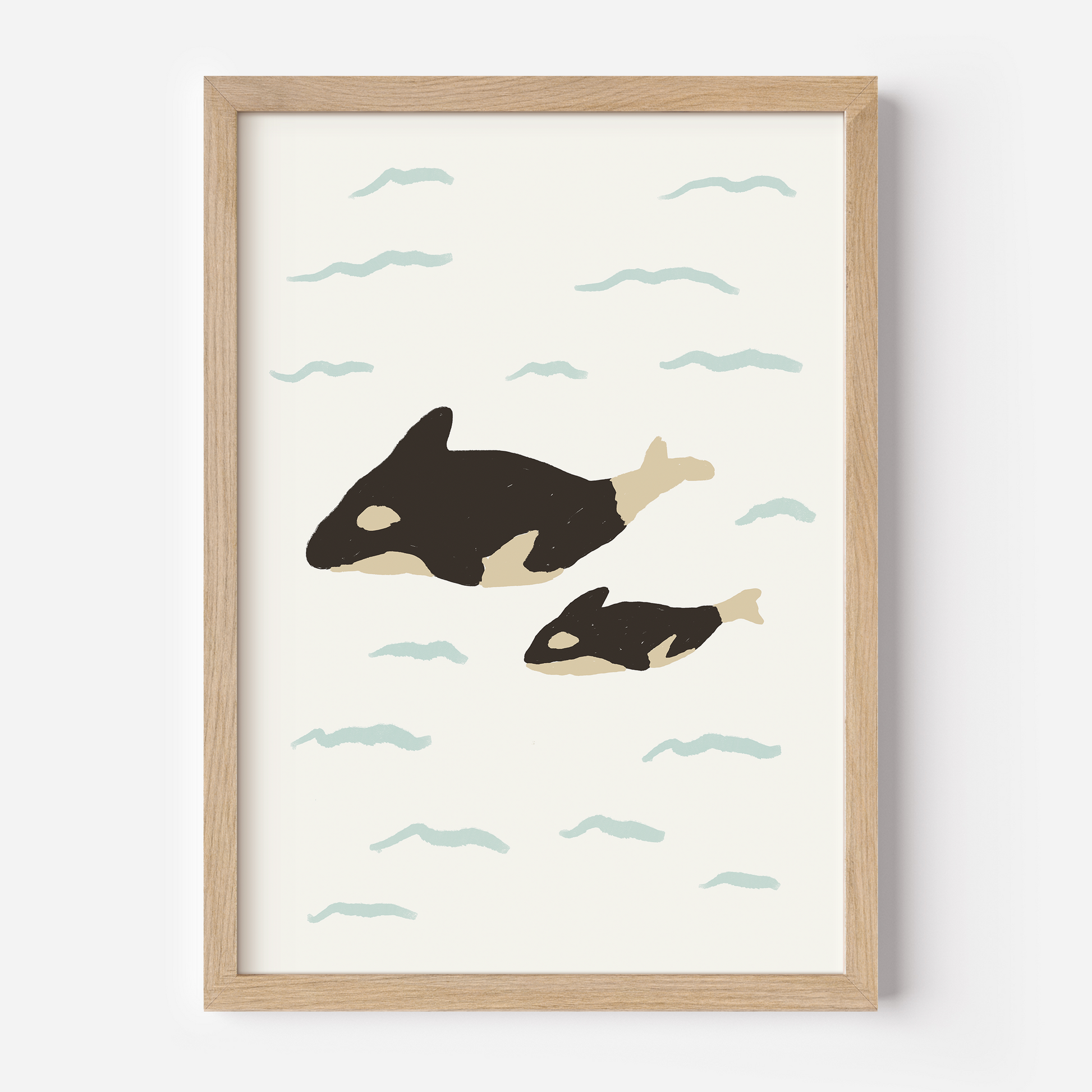 איור מקורי מתוך קולקציית הילדים השואבת השראה מהפשטות והיופי שבטבע. הקולקציה עוסקת בצבעוניות וקו אשר שואפים להרמוניה ופישוט של הצורניות הטבעית. באיור מוצגים לויתנים שוחים, בצורה פשוטה ורכה.